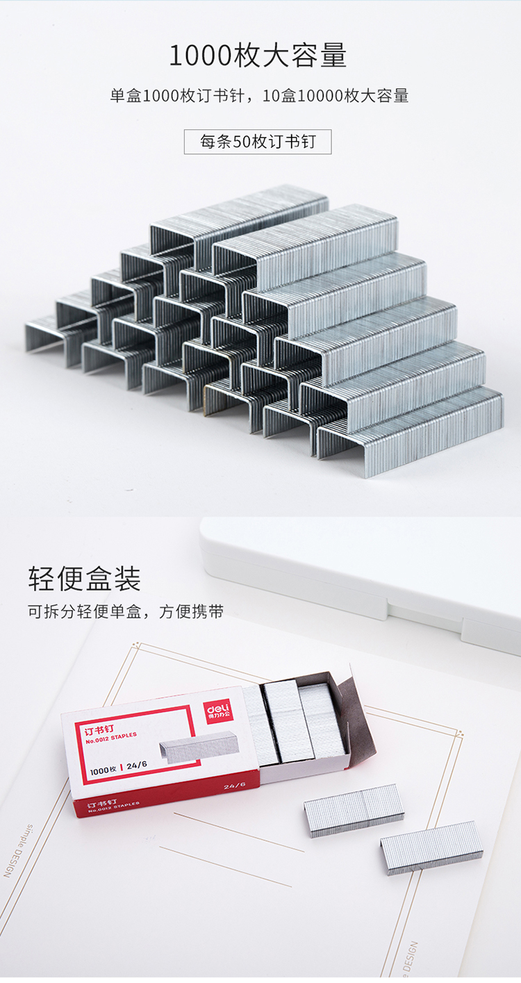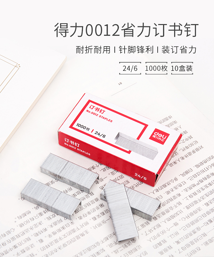商品名称:得力 0012高强度订书钉 12#订书针 1000枚/盒 10盒装(单位:条)