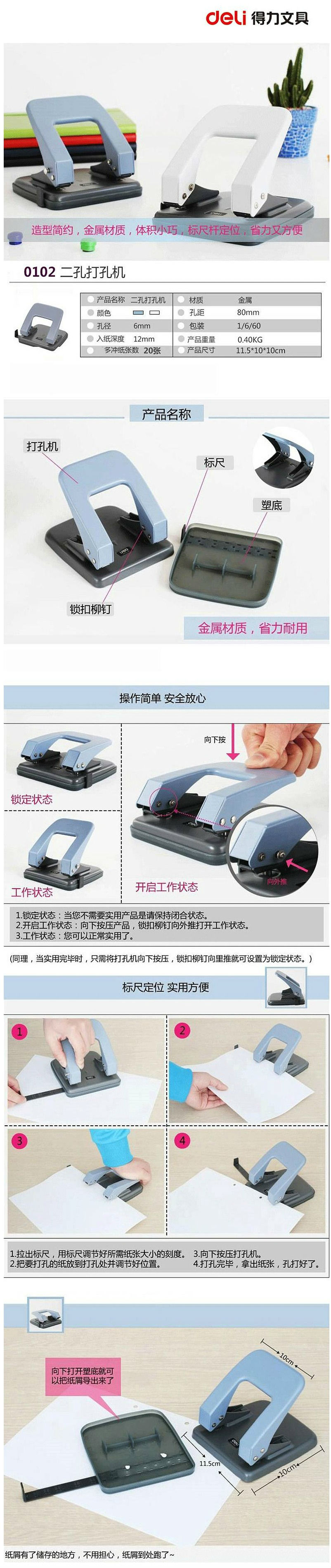 得力 0102 两孔中号打孔机 带标尺φ6mm可打20页 颜色随机(单位:台)
