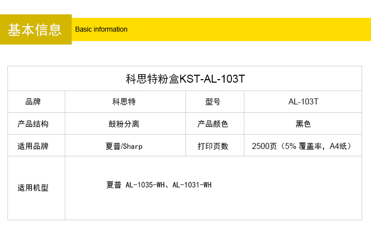 商品名称:215 电脑、办公 文具/耗材 硒鼓/墨粉 分离式粉盒 科思特 K AL-103T(粉盒) 黑色 A4,5%覆盖率,打印量2500 Sharp Sharp /夏普AL-1035-WH、AL-1031-WH 个 448