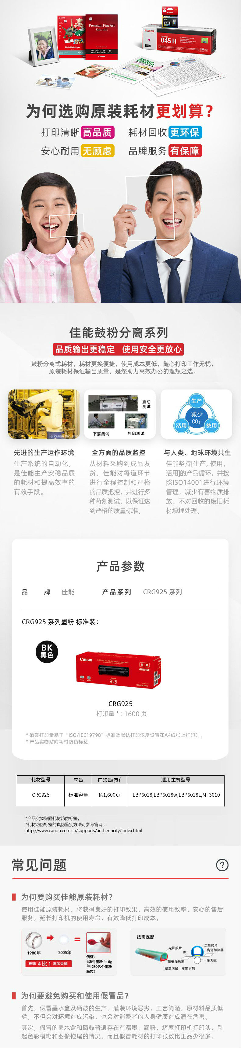 商品名称:佳能(Canon)CRG-925 原装黑色硒鼓(适用机型LBP6018、 LBP6018w、LBP6018L、 iC MF3010)