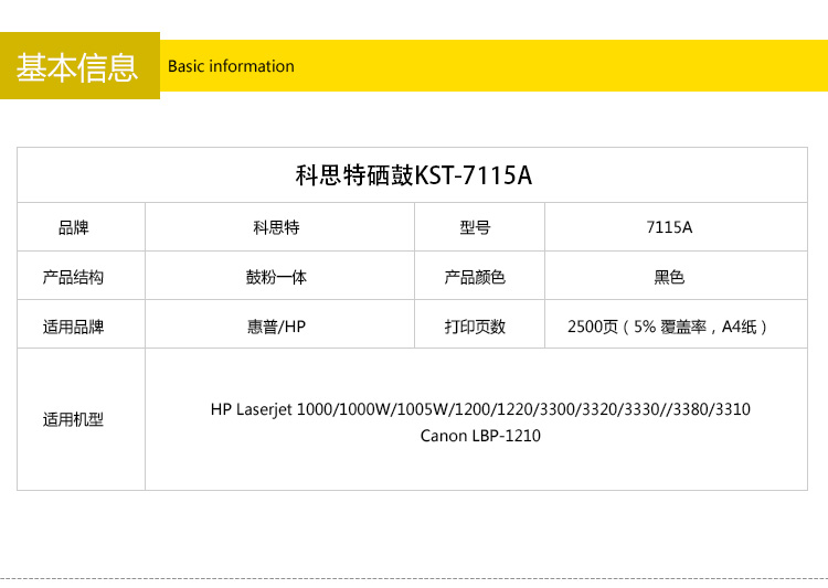 商品名称:科思特 C7115A/EP25硒鼓 适用惠普 Laserjet 1000/1000W/1005W/1200/1220/3300/3320/3330//3380/3310/Canon LBP-1210//Canon LBP-1210黑色 专业
