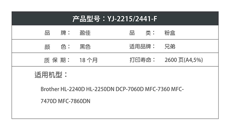 商品名称:盈佳YJ TN2215/2441黑粉 适用于:Brother HL-2240D HL-2250DN DCP-7060D MFC-7360 MFC-7470D MFC-7860DN