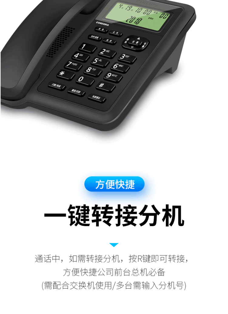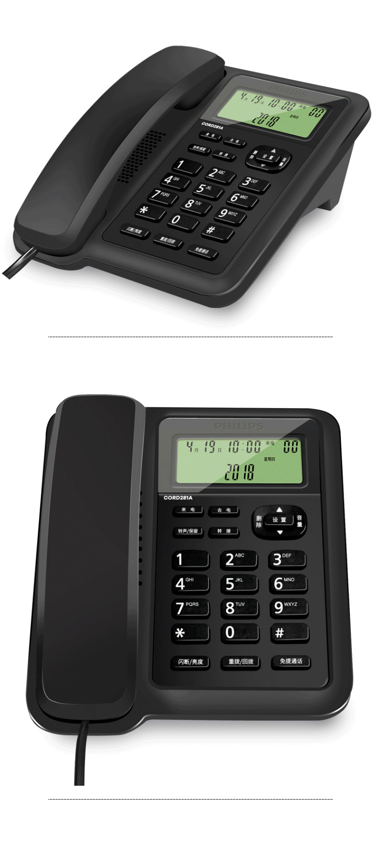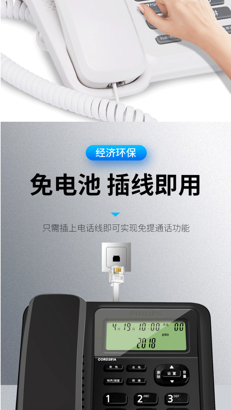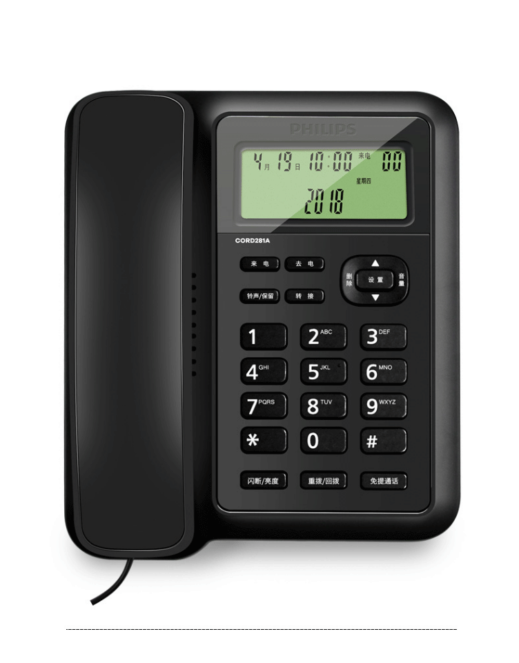 商品名称:飞利浦(PHILIPS)电话机座机 固定电话 双接口 免电池 CORD281A黑色