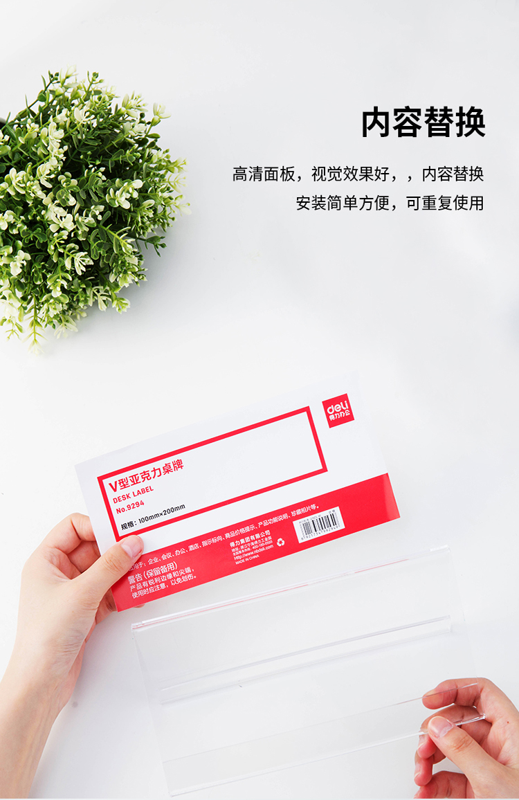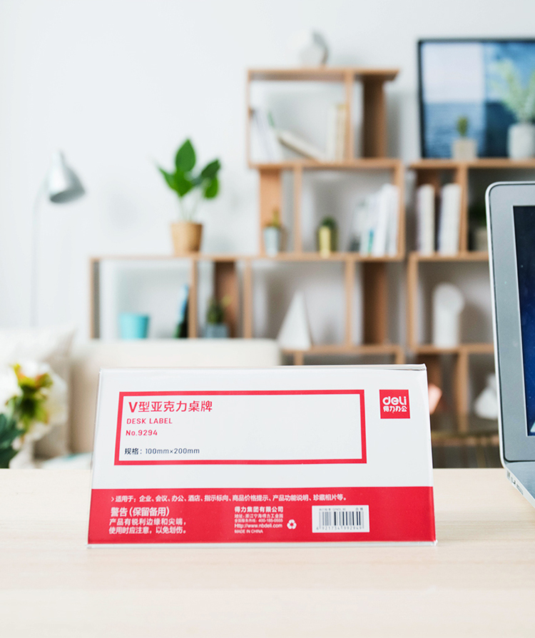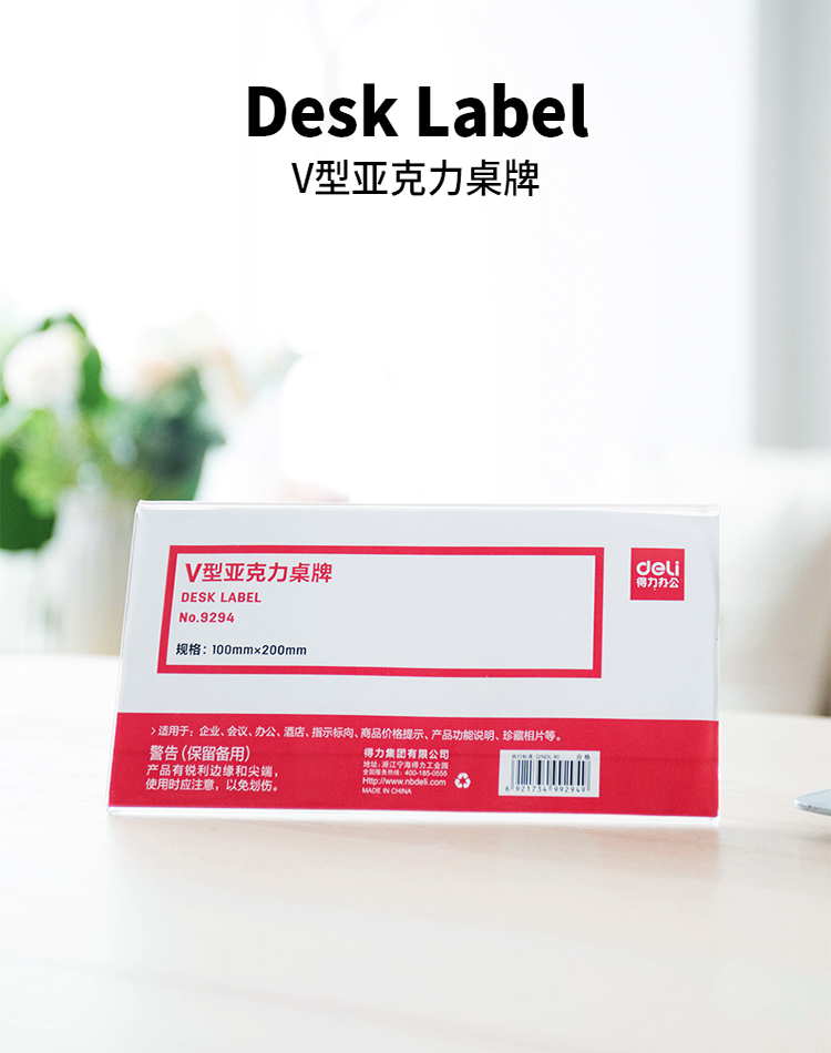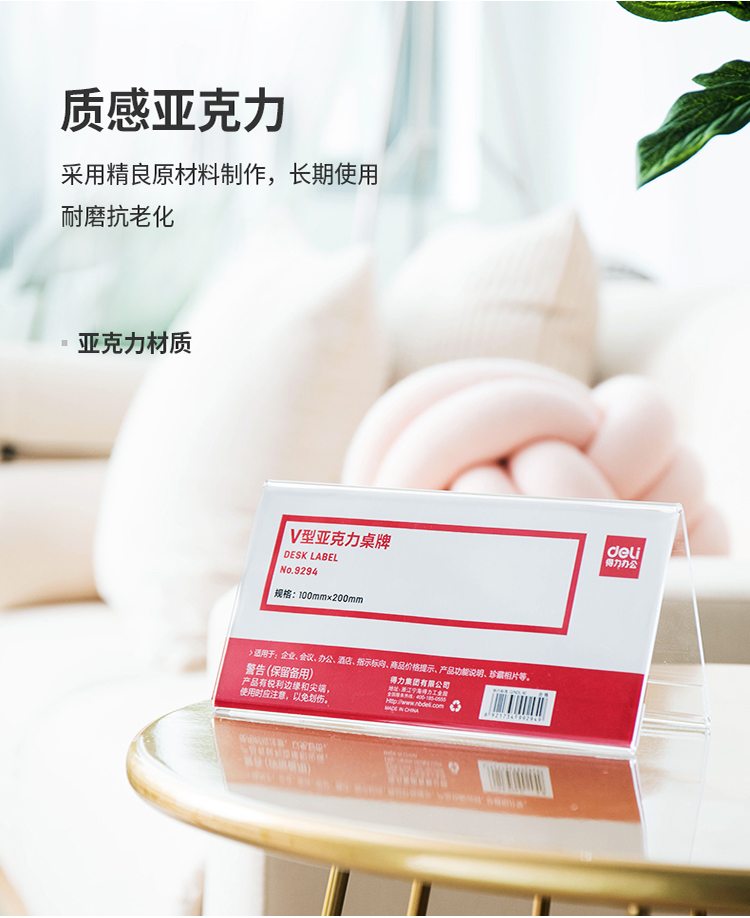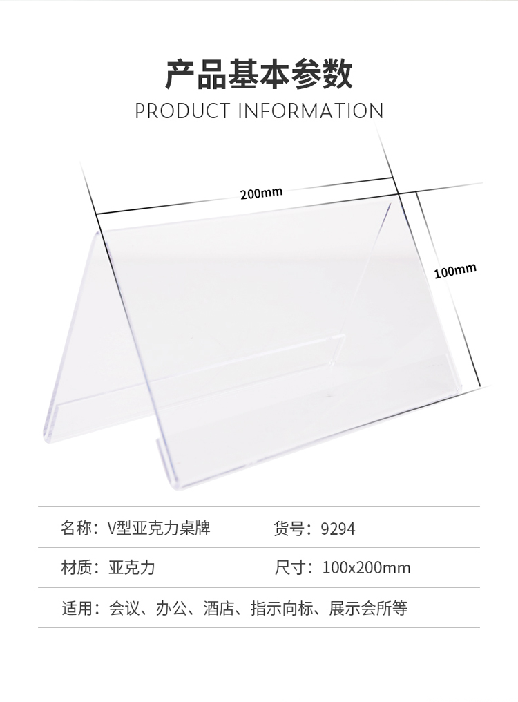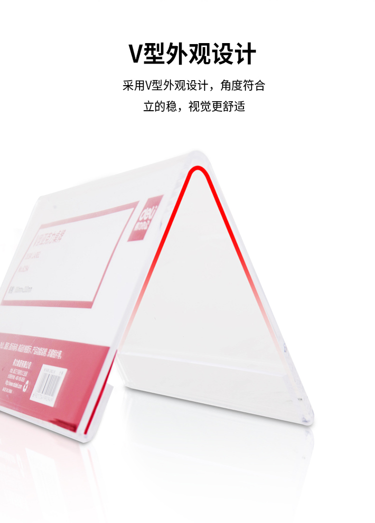 商品名称:得力(deli)100*200mmV型亚克力桌牌展示牌 双面透明 9294