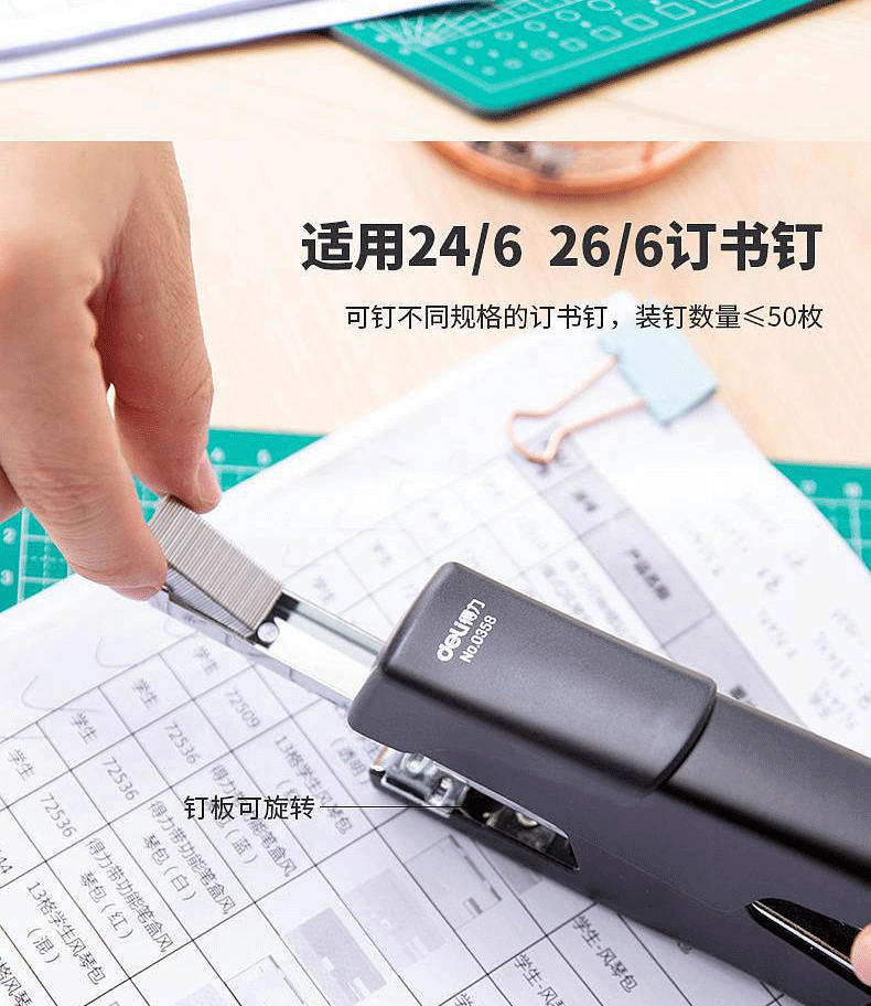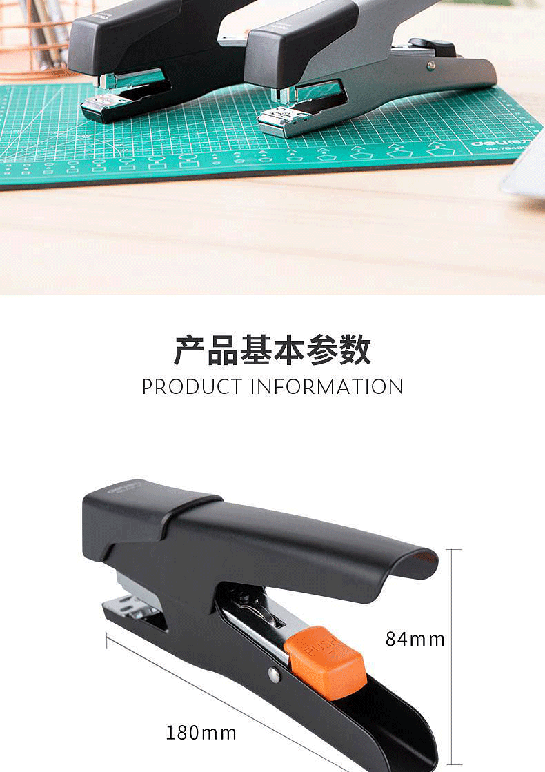 商品名称:得力(deli) 金属手握式中型订书机旋转钳式省力型订书器12号标准装订机 0358颜色随机