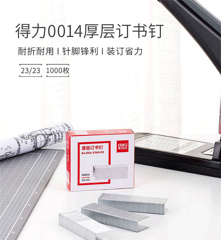 商品名称:得力(deli)0014订书针重型厚层大订书钉 23/23 可订210页 (单位:盒)