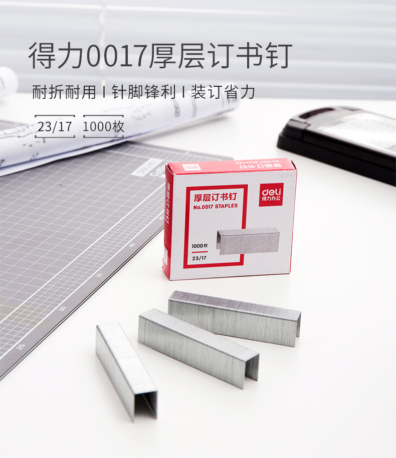 商品名称:得力(deli)0017重型厚层大订书钉订书针23/17 可订120页 (单位:盒)