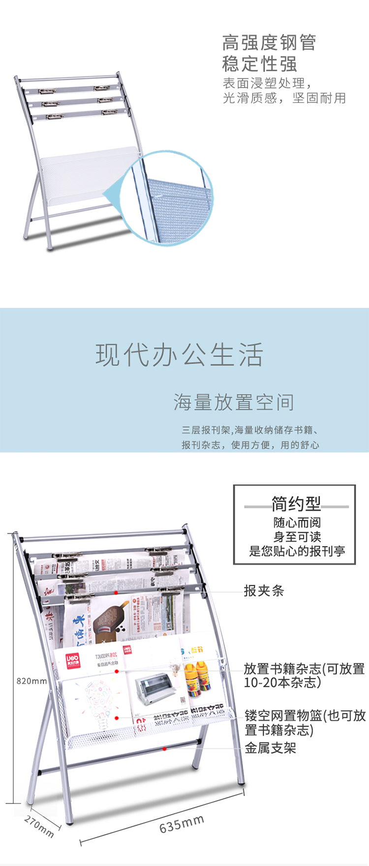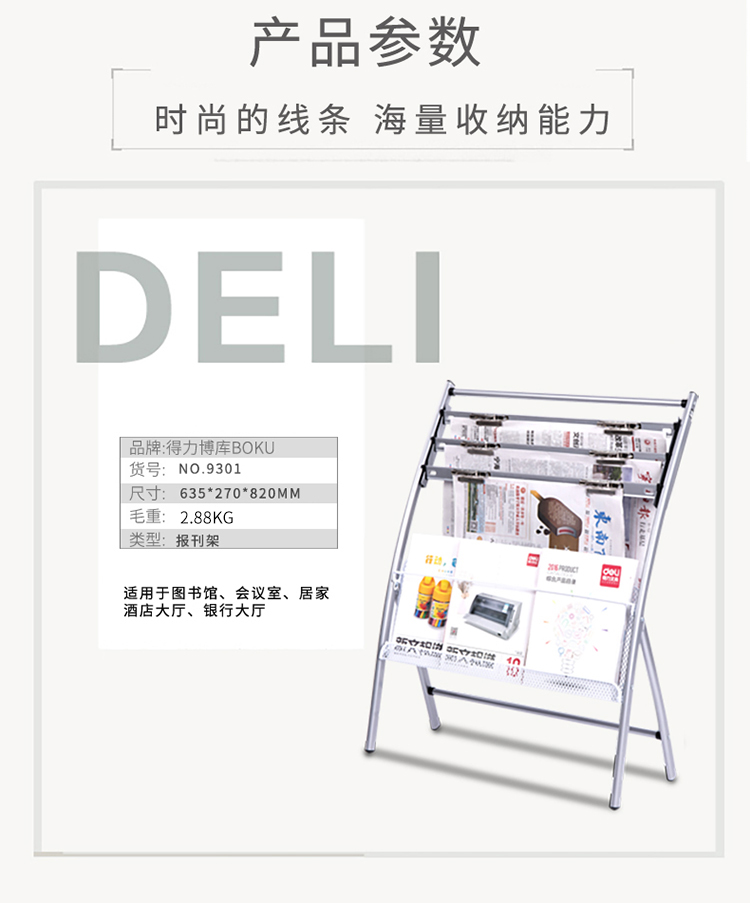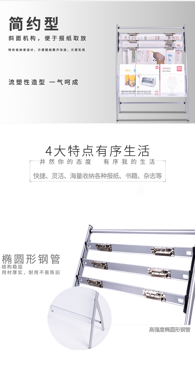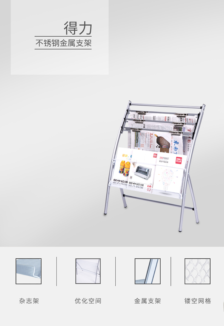 商品名称:得力(deli)四层铝合金夹条报纸架9301报刊架 图书馆报夹条 宣传杂志展示架 高0.8米