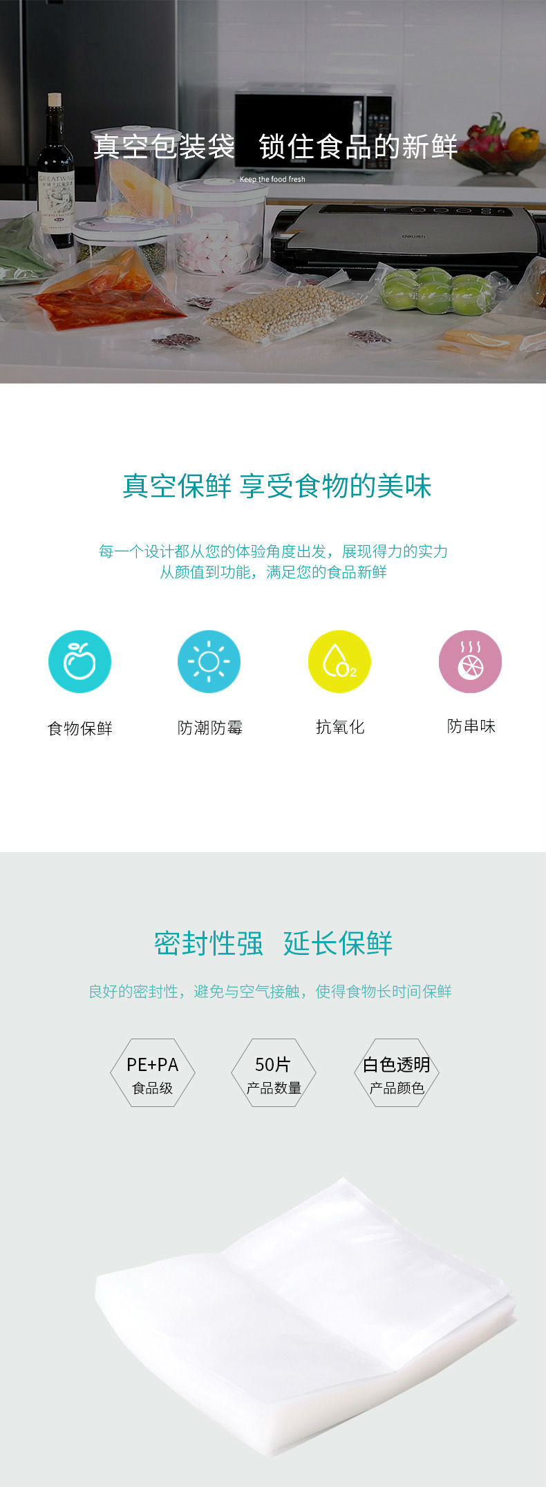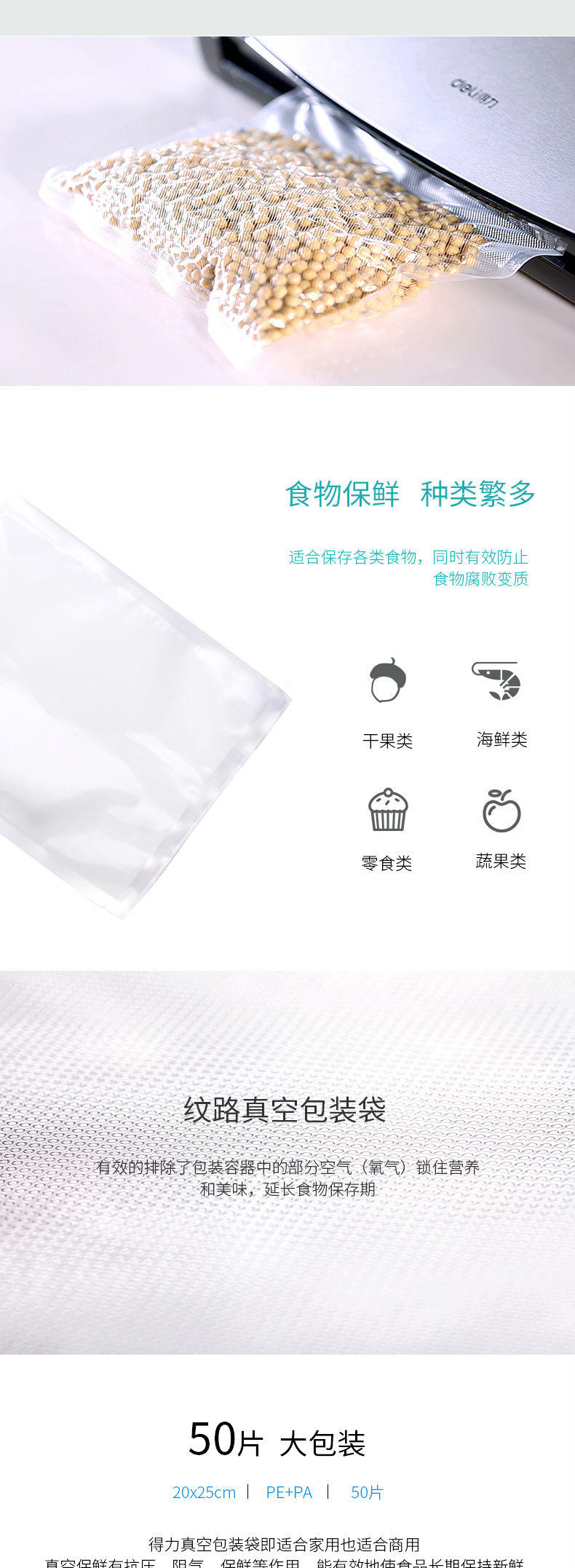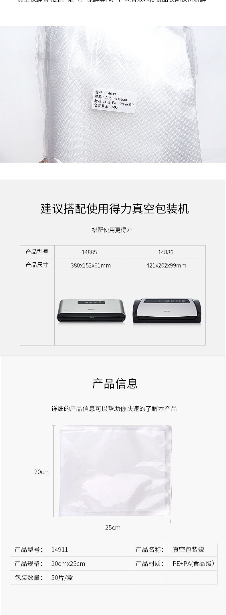 商品名称:得力(deli)14911 真空机包装袋 食物真空保鲜袋 包装袋20*25CM(本色)(50片/盒)