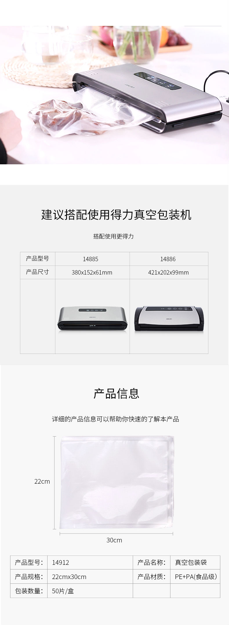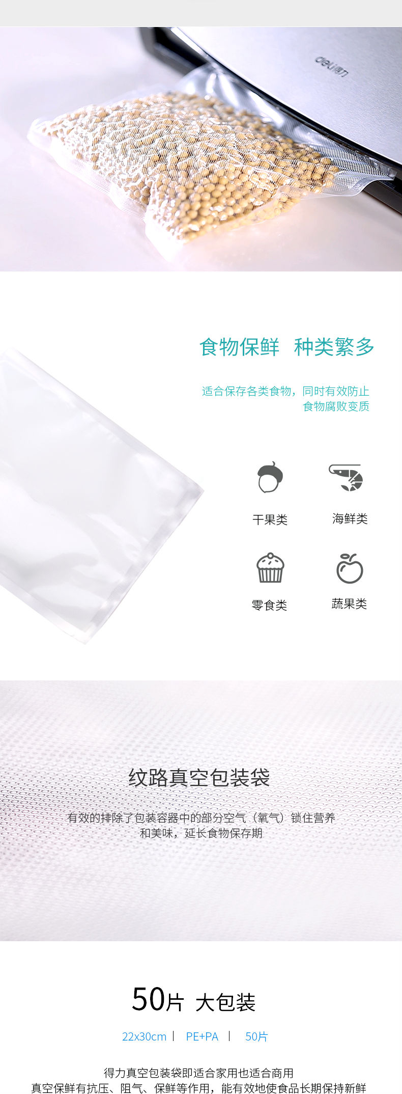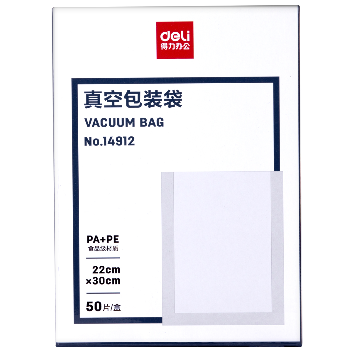 商品名称:得力(deli)14912真空机包装袋 食物真空保鲜袋22*30CM (本色)(50片/盒)
