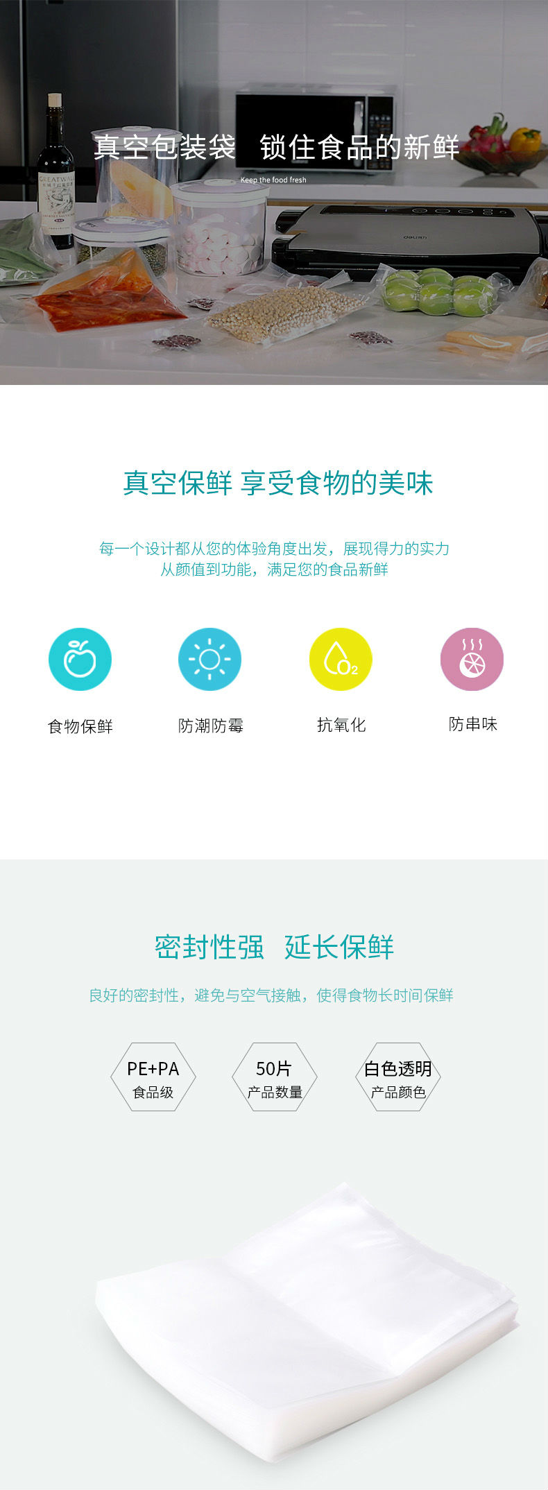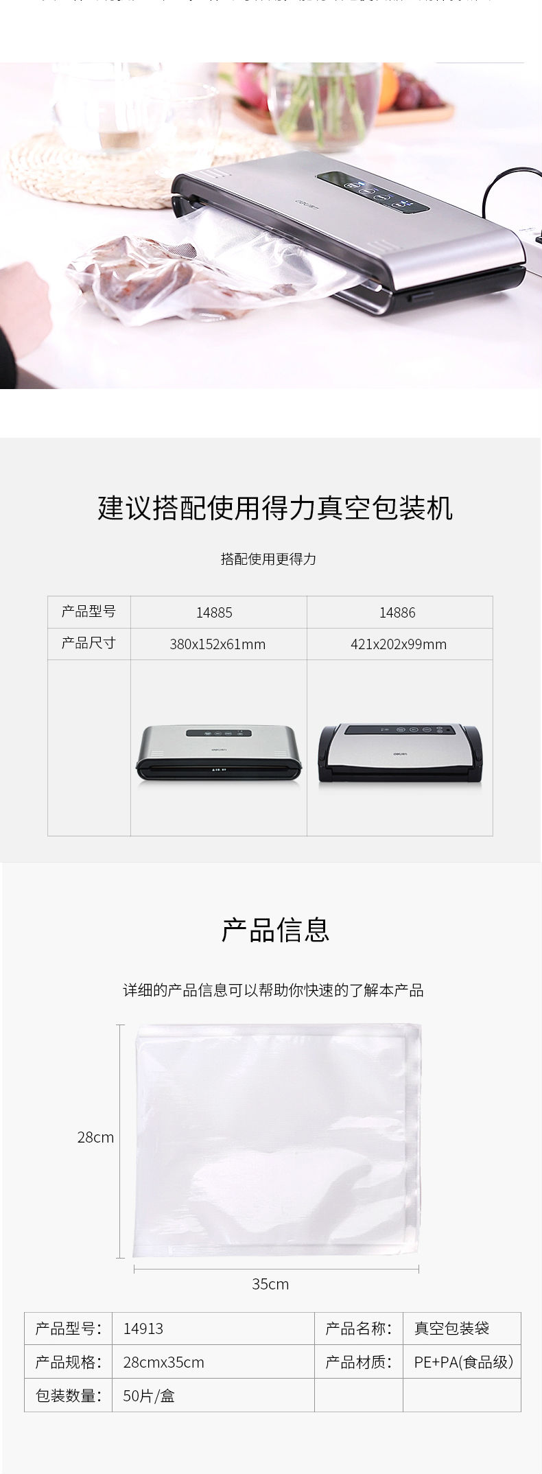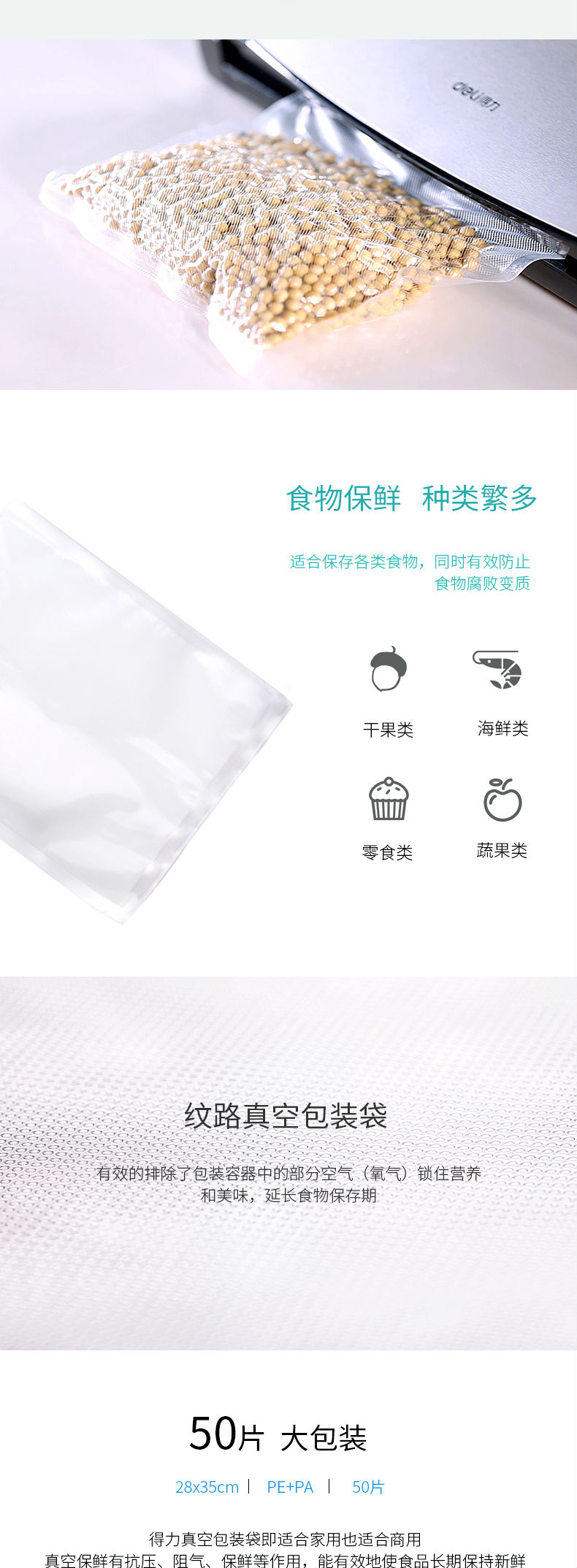 商品名称:得力(deli)14913真空机包装袋 食物真空保鲜袋 包装袋28*35CM(本色)(50片/盒)