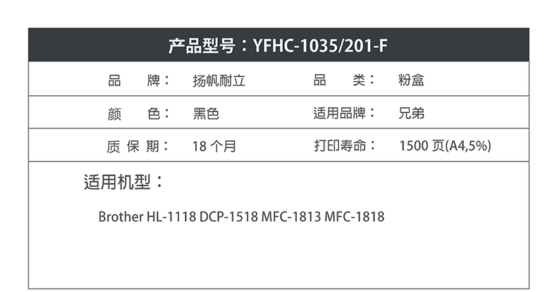 商品名称:扬帆耐立YFHC TN1035/201-F 黑粉 适用于:Brother HL-1118 DCP-1518 MFC-1813 MFC-1818