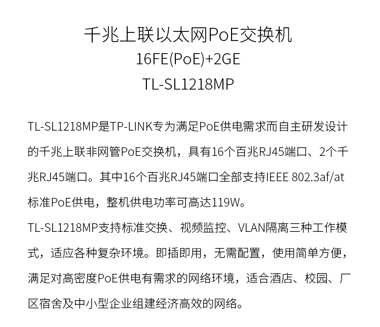 商品名称:TP-LINK 企业级非网管型POE交换机 TL-SL1218MP
