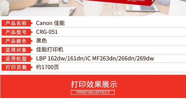 商品名称:佳能(Canon)CRG-051 标准容量原装黑色墨粉(适用LBP 162dw/161dn/iC MF263dn/266dn/269dw机型) 约1700页