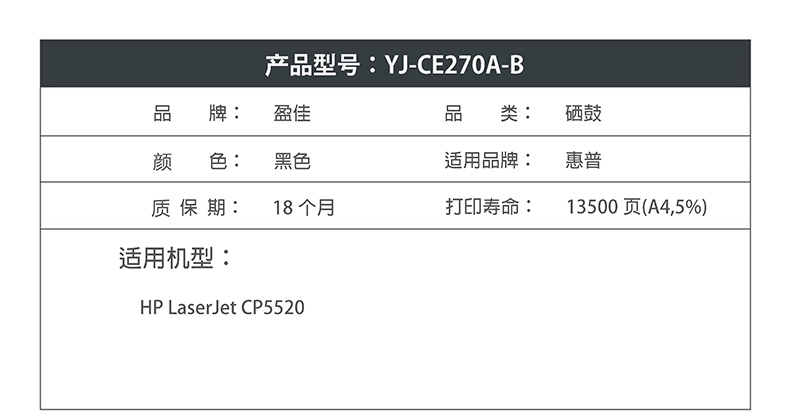 商品名称:盈佳YJ CE270A(650A)黑色硒鼓(带芯片) 适用:HP LaserJet CP5520