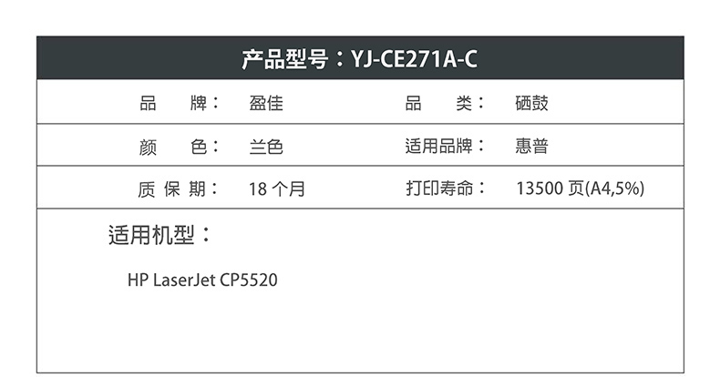 商品名称:盈佳YJ CE271A(650A)兰色硒鼓(带芯片) 适用:HP LaserJet CP5520