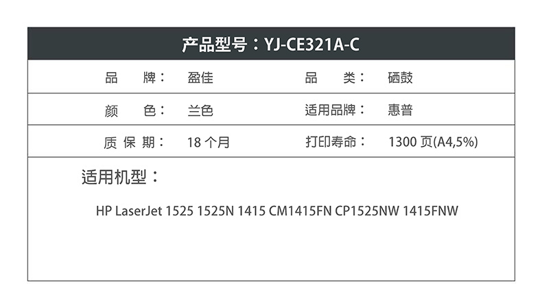 商品名称:盈佳YJ CE321A(128A)兰色硒鼓(带芯片) 适用:HP LaserJet 1525 1525N 1415 CM1415FN CP1525NW 1415FNW