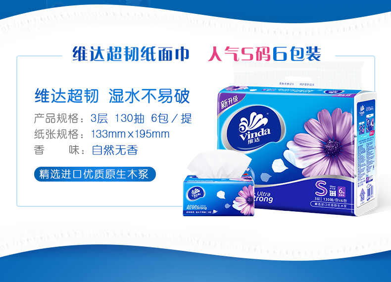 商品名称:维达(Vinda) V2239 纸抽 面巾纸 餐巾纸 超韧软包抽纸 130抽/包 6包/提(单位:提)