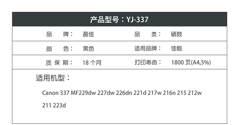商品名称:盈佳YJ CN-337黑鼓(带芯片) 适用于:Canon 337 MF229dw 227dw 226dn 221d 217w 216n 215 212w 211 223d MF243d