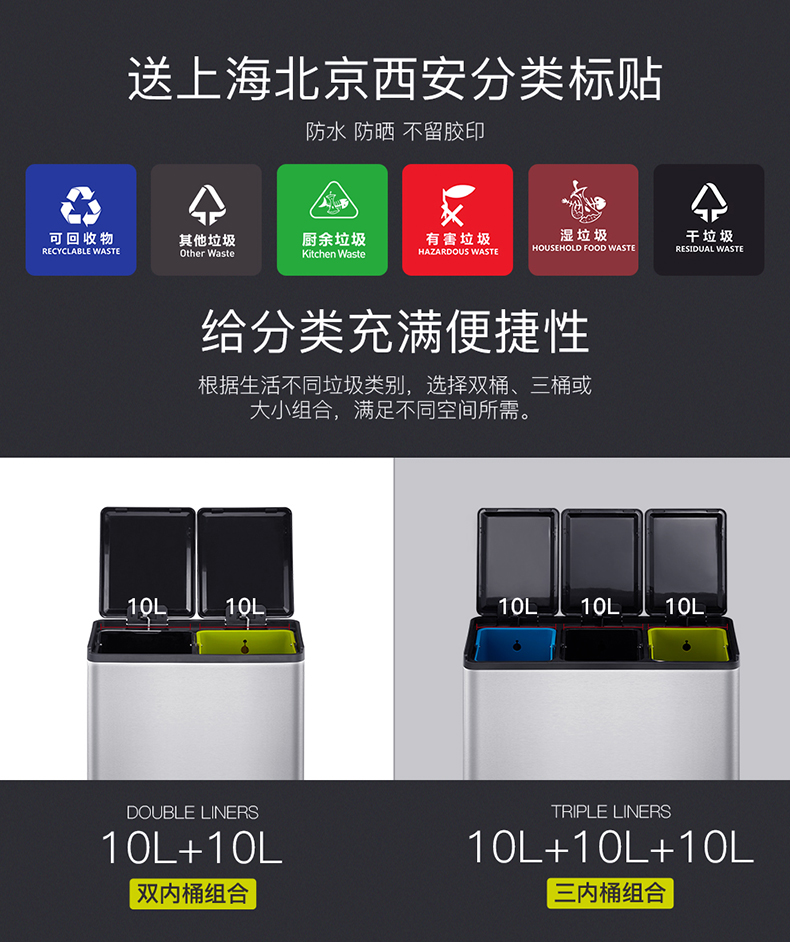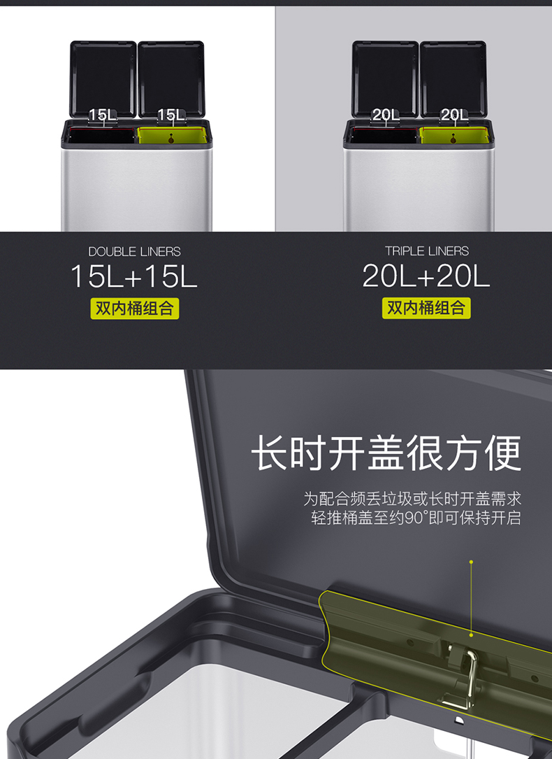商品名称:EKO分类垃圾桶 干湿分离大号不锈钢独立脚踏式带盖桶 EK8229MT-15L+15L
