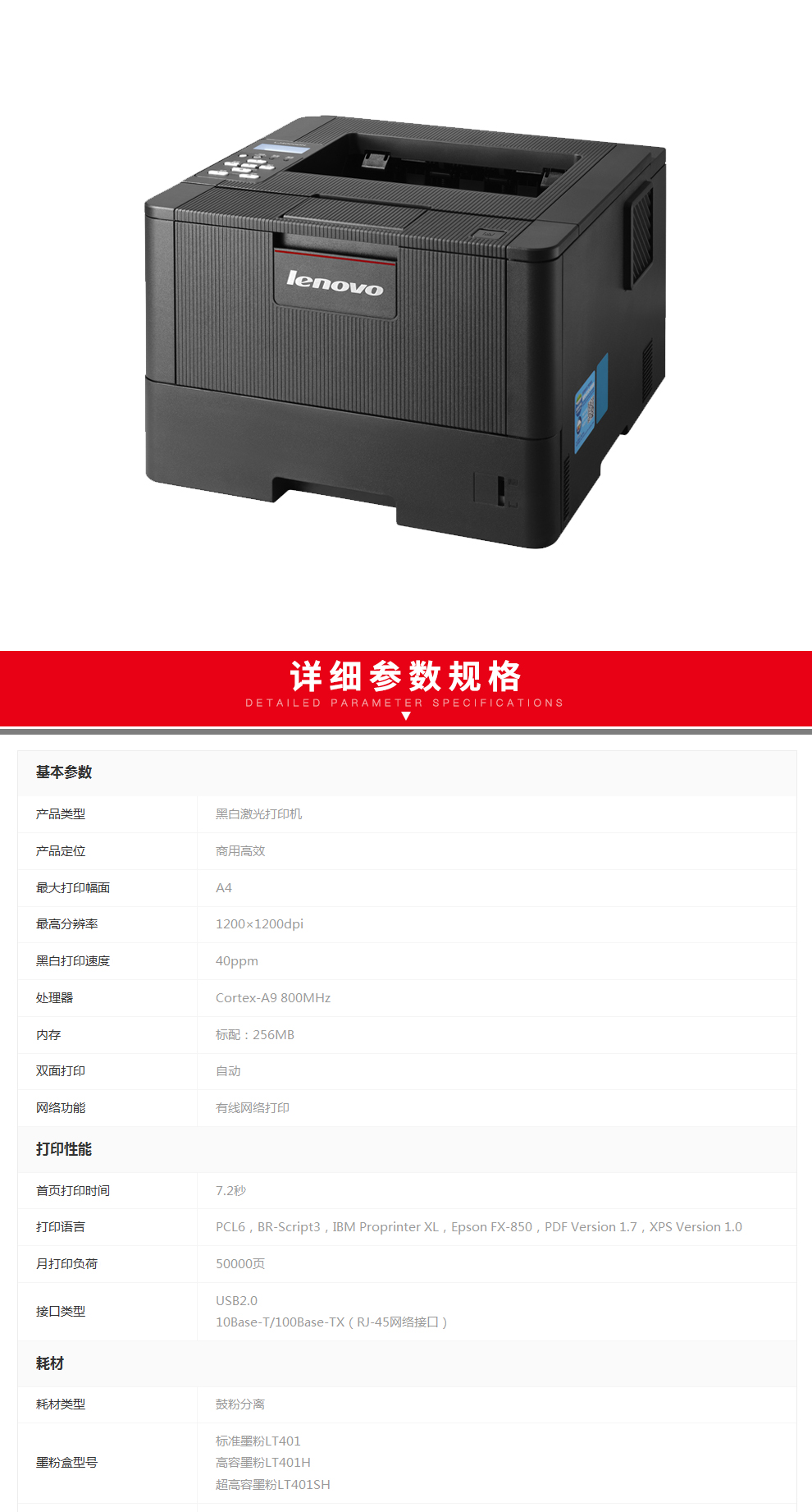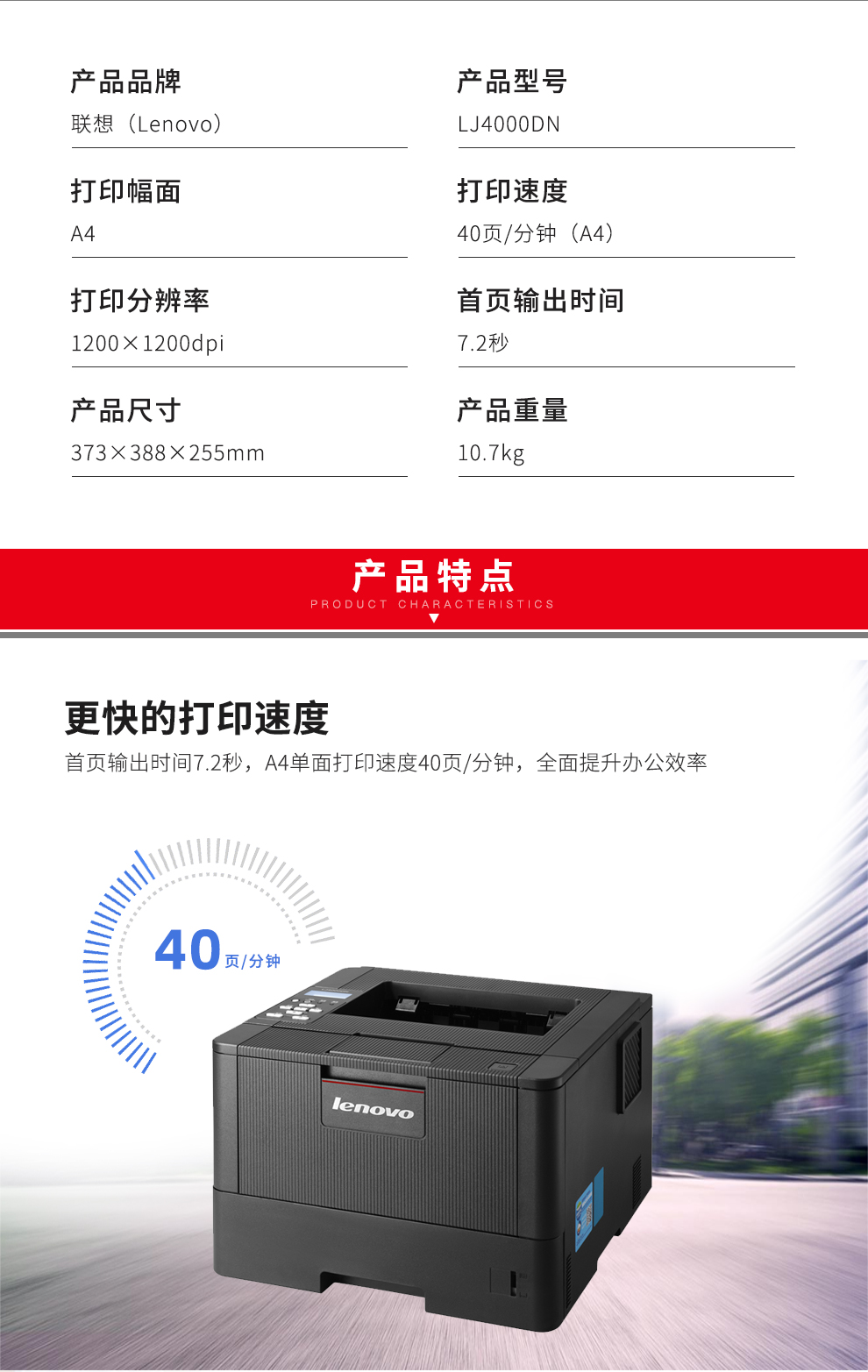 商品名称:联想(Lenovo)LJ4000DN A4黑白激光打印机 自动双面打印/有线网络