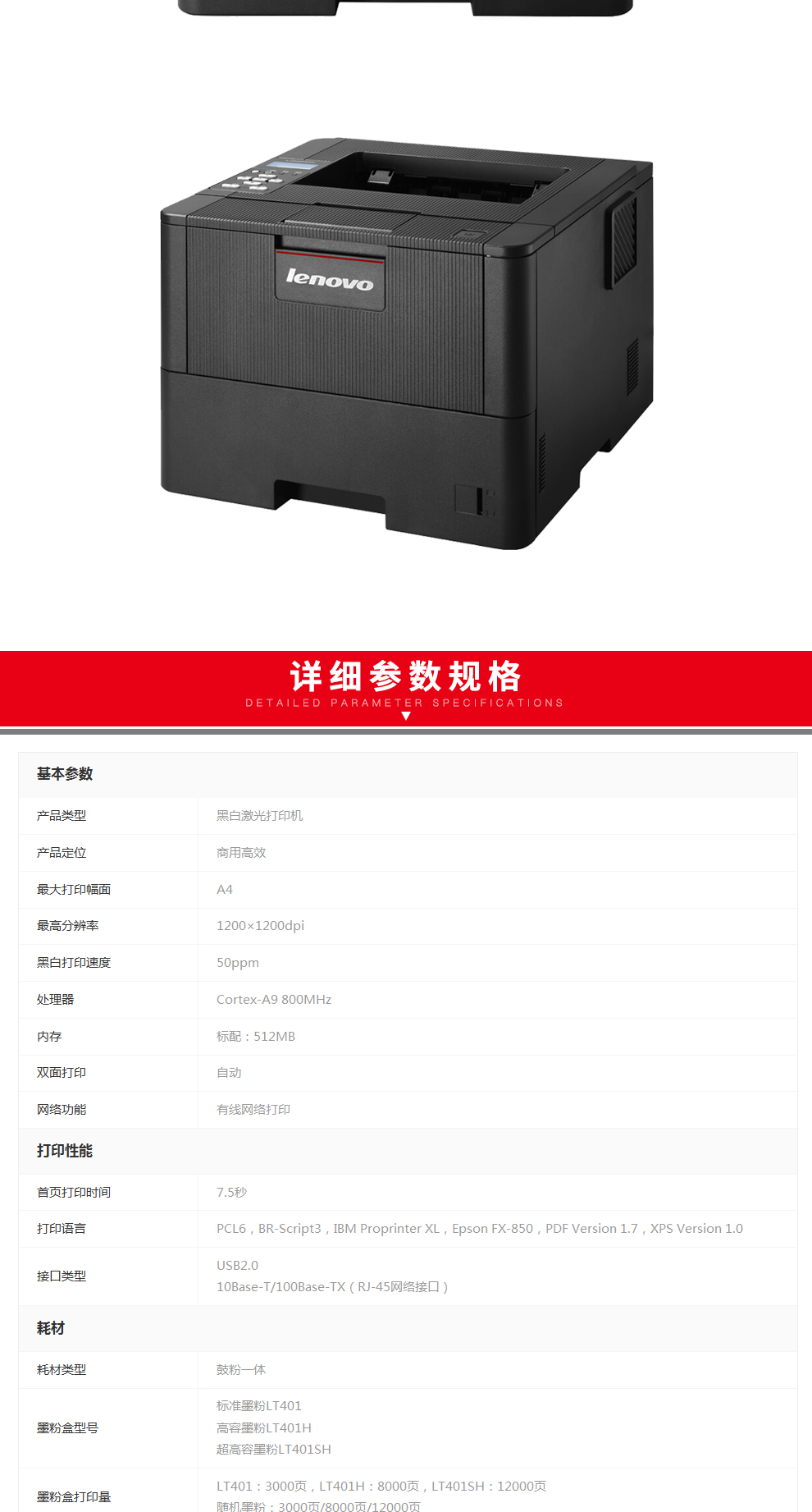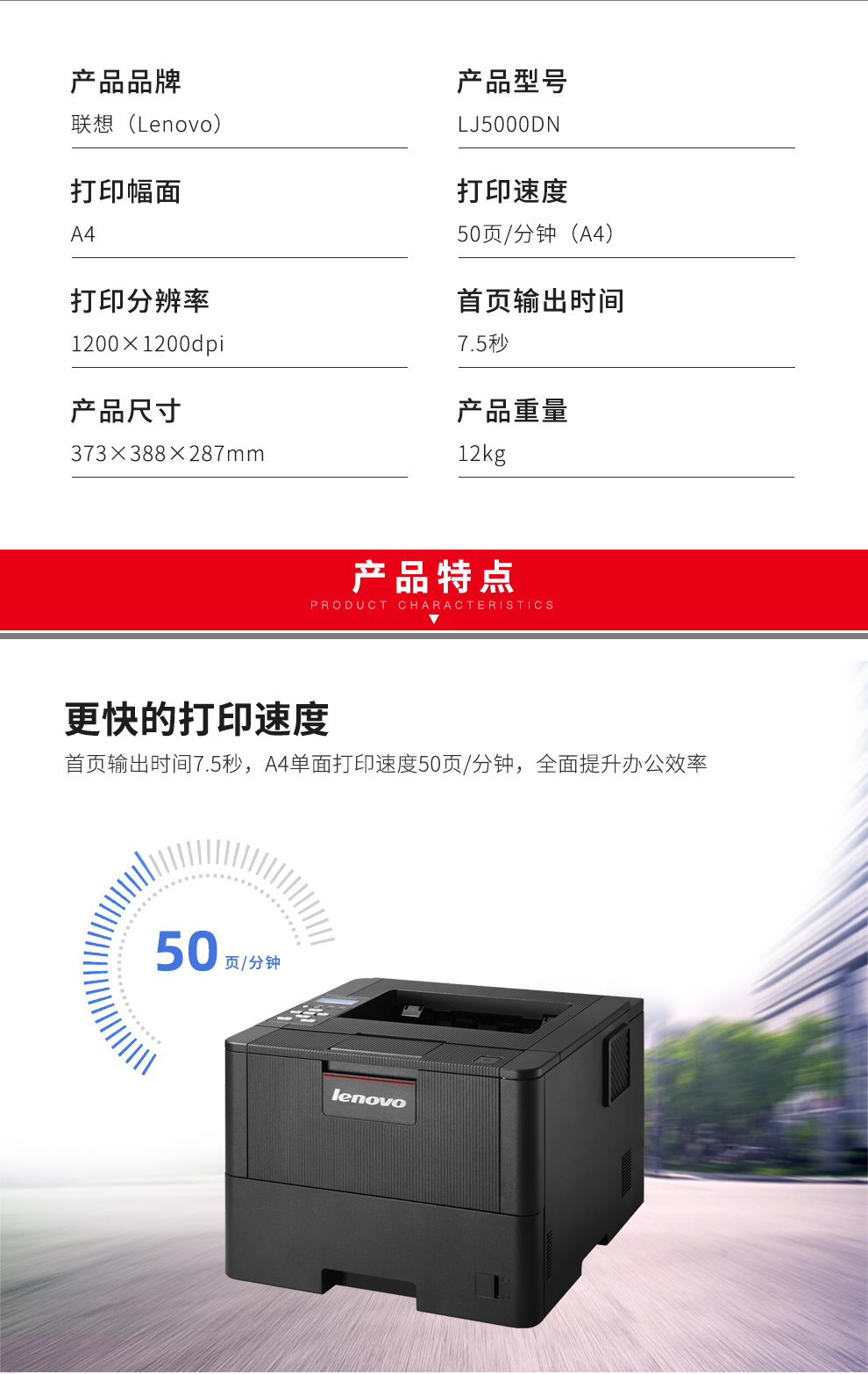 商品名称:联想(Lenovo)LJ5000DN A4黑白激光打印机 自动双面打印/有线网络