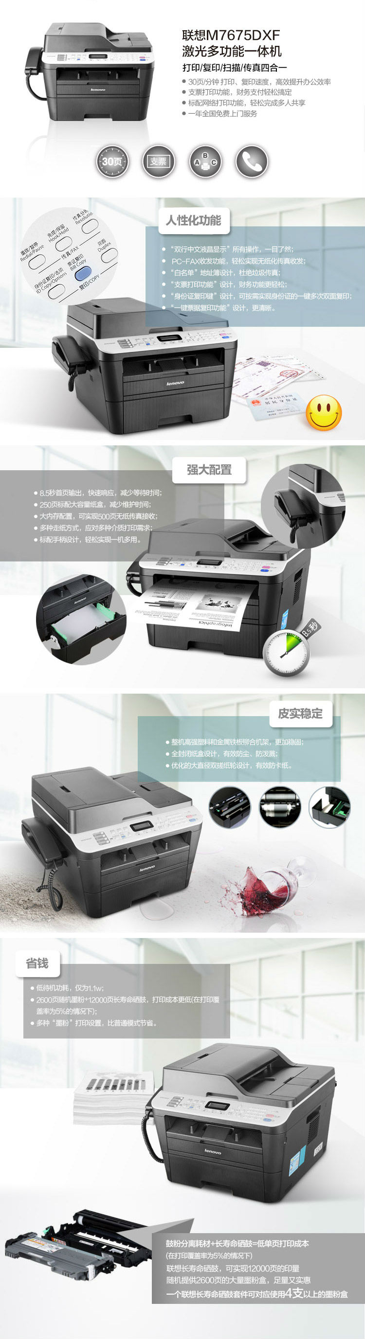 联想(Lenovo)M7675DXF 黑白激光多功能一体机 自动双面打印