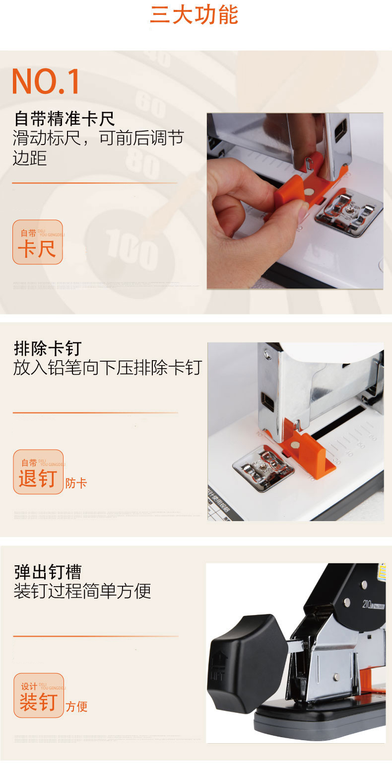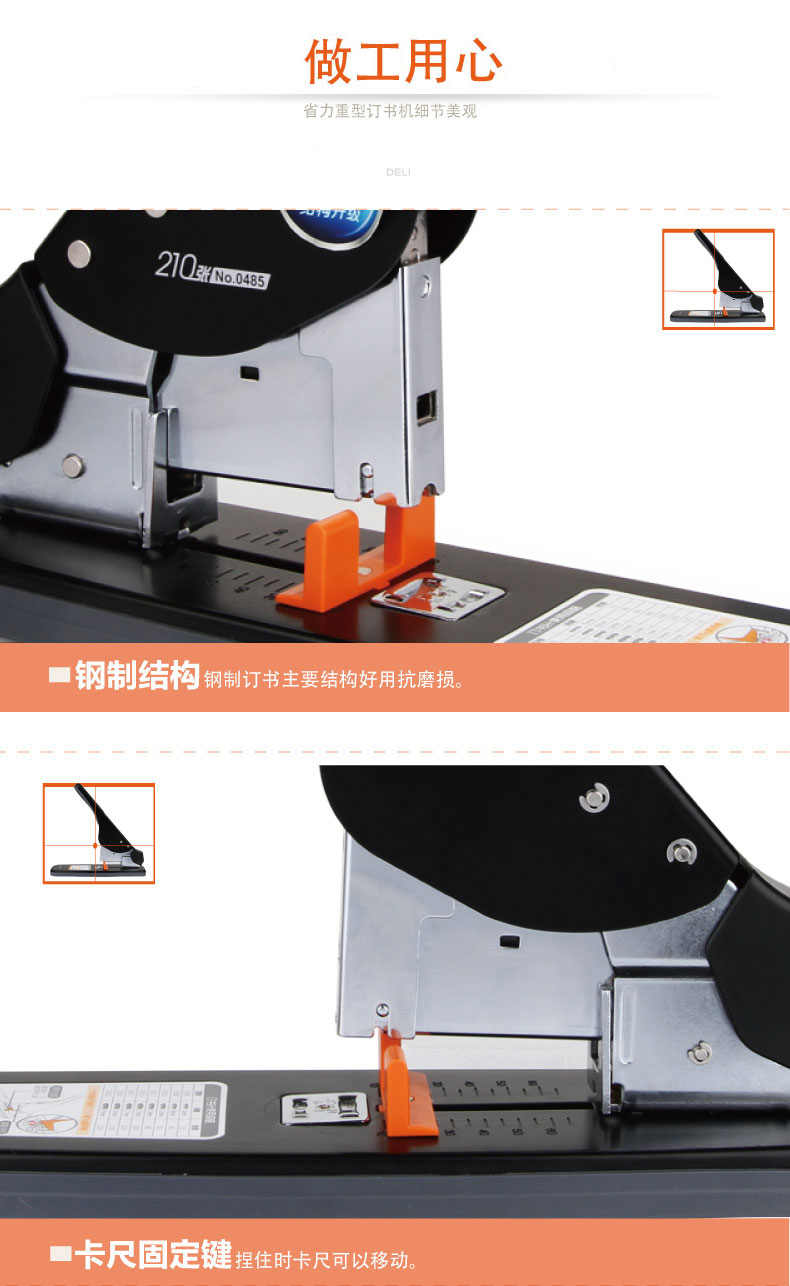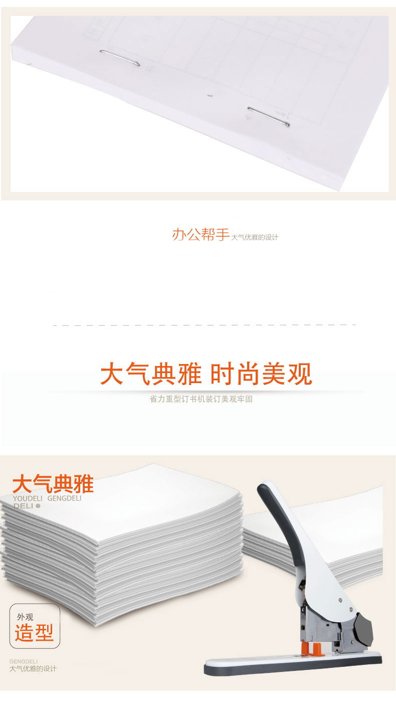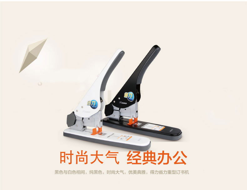 商品名称:得力(deli) 0485省力加厚重型订书机 大号订书机 可订210页 白色