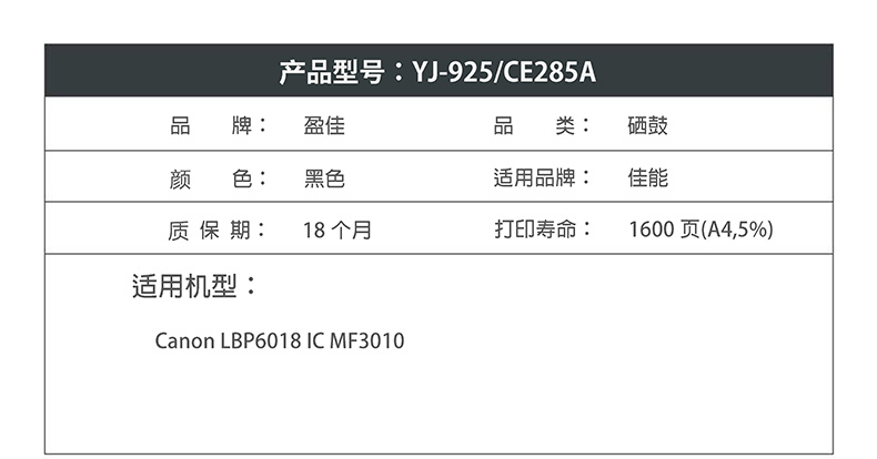 商品名称:盈佳YJ 925/CE285A黑色硒鼓(带芯片) 适用于:Canon LBP6018 IC MF3010