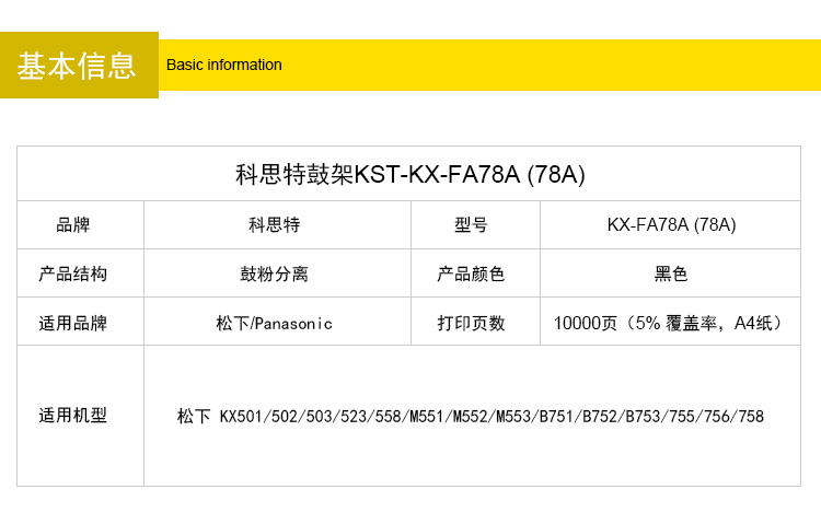 商品名称:科思特 78A(鼓架) 适用松下 KX501/502/503/523/558/M551/M552/M553/B751/B752/B753/755/756/758黑色 专业版