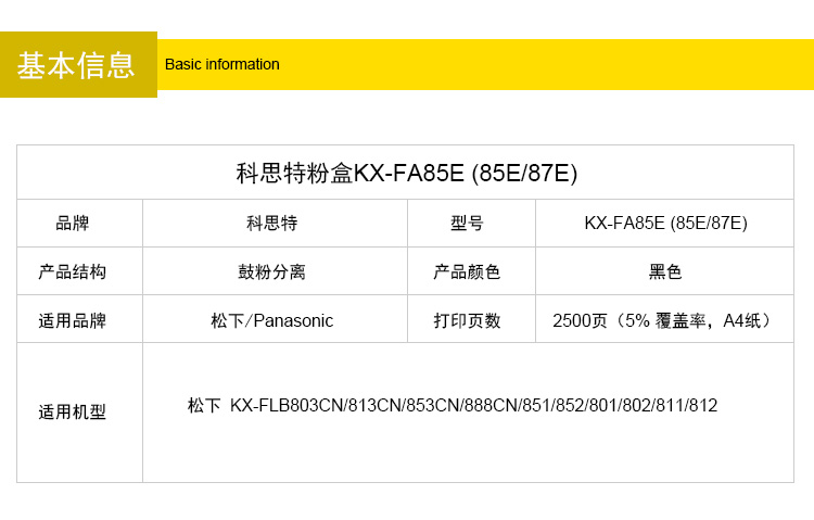 商品名称:科思特 85E(粉筒) 适用松下 KX-FLB803CN/813CN/853CN/888CN/851/852/801/802/811/812黑色 专业版