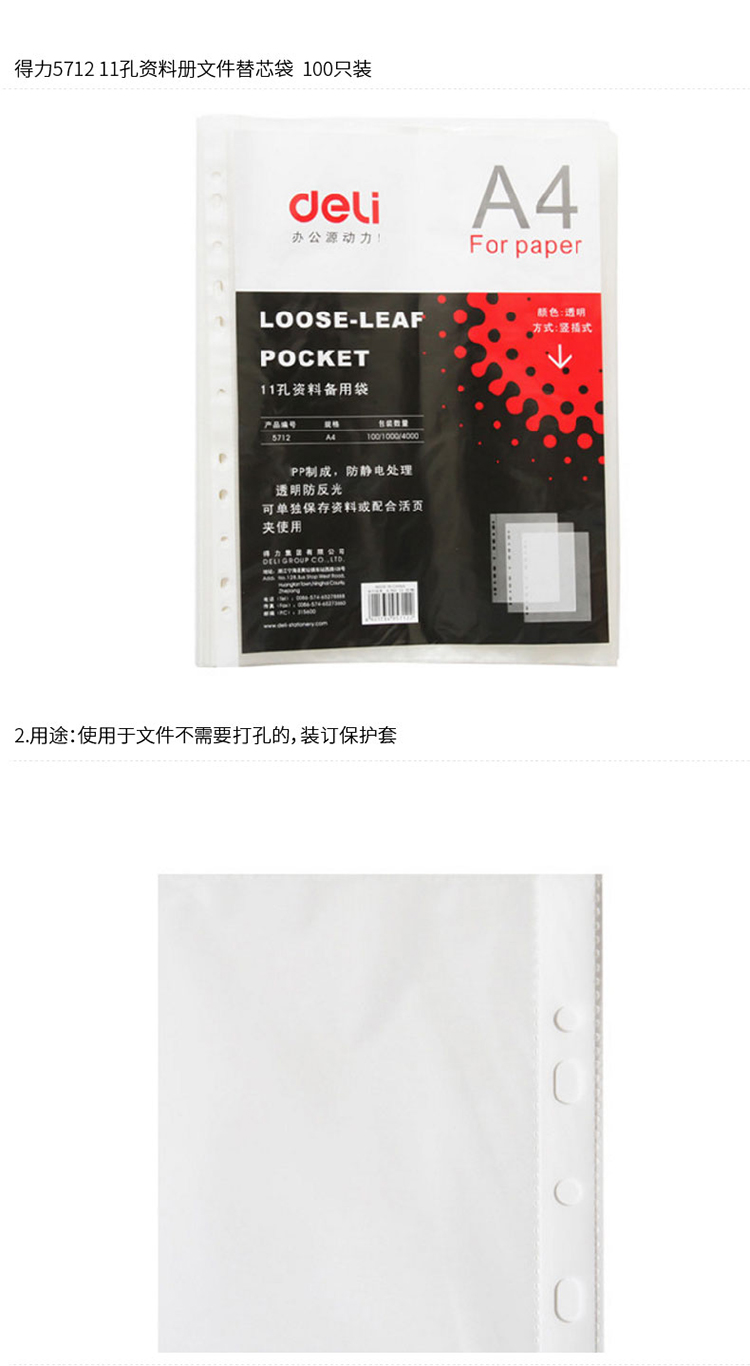 商品名称:得力11孔透明文件袋 a4加厚活页资料袋 5712 100只/包 (单位:包)