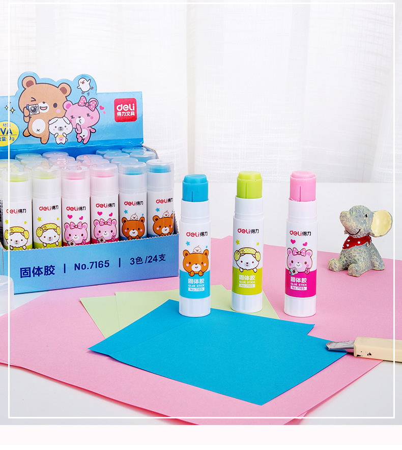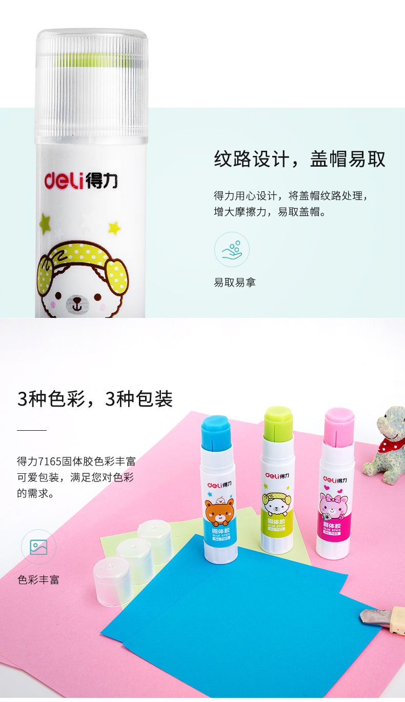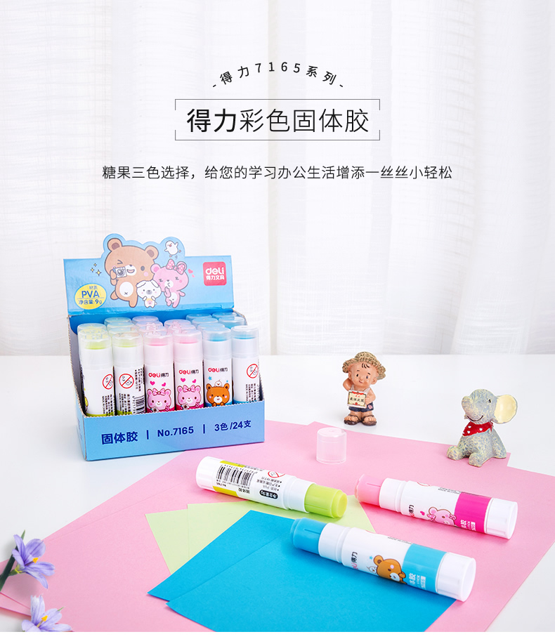 商品名称:得力文具7165无甲醛安全环保固体胶 9g 混色装 (单位:支 颜色随机)