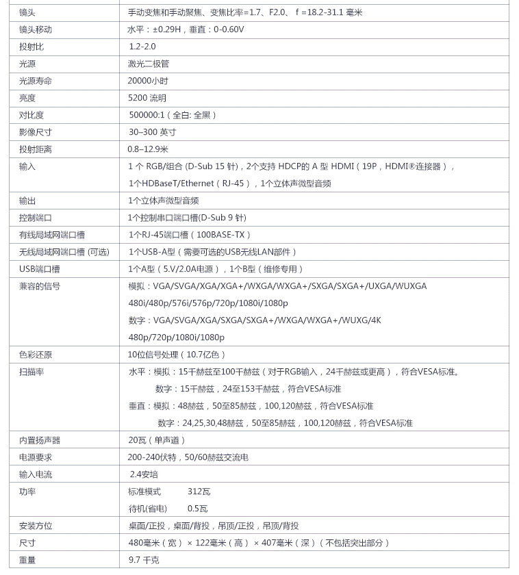 商品名称:NEC NP-CB4500WL投影仪 投影机 商用 办公(5200流明 激光光源 WXGA分辨率兼容4K)
