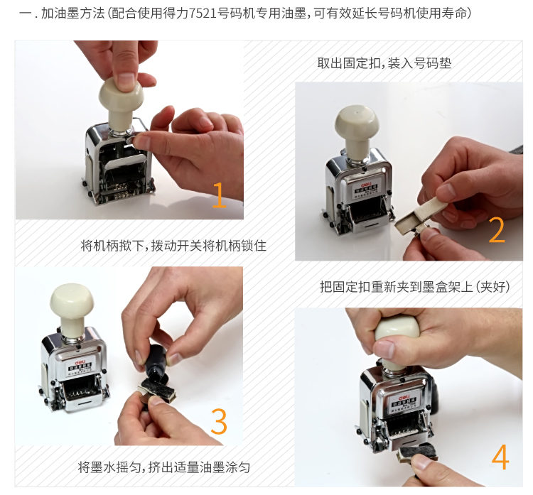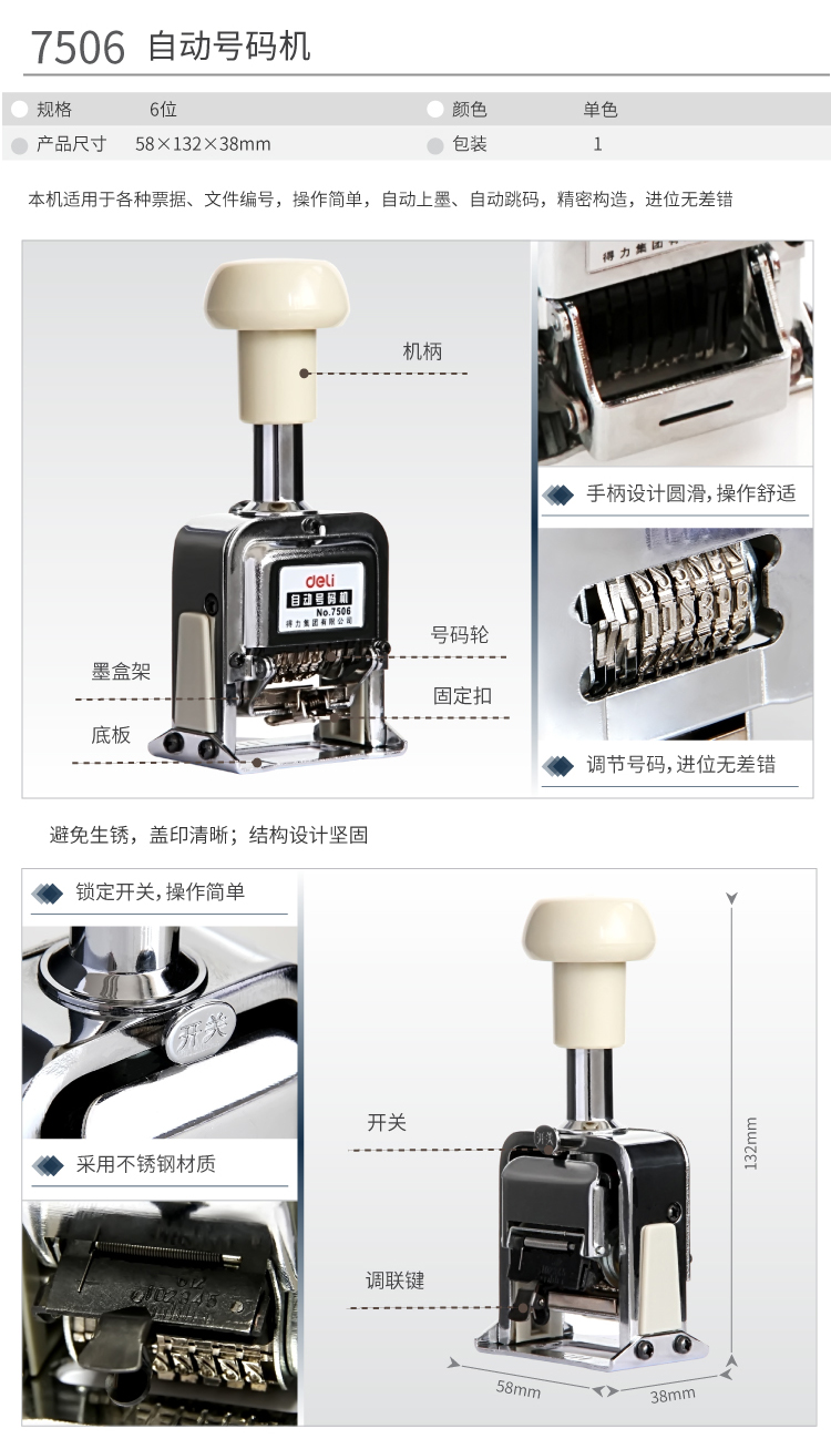 商品名称:得力(deli) 6位财务办公自动号码机/打码机 7506