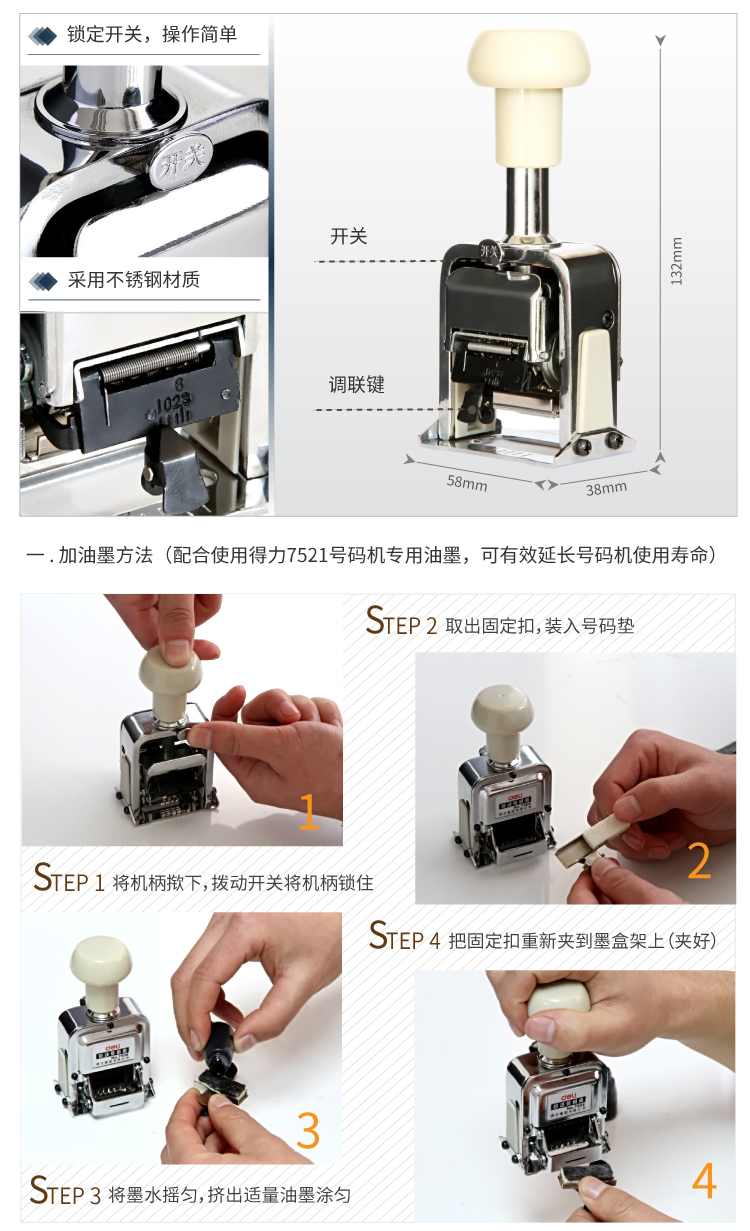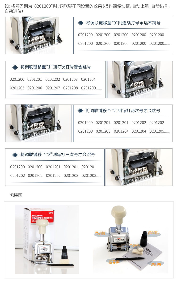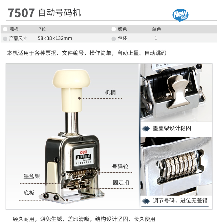 商品名称:得力(deli)7位办公财务自动号码机/打码机 7507
