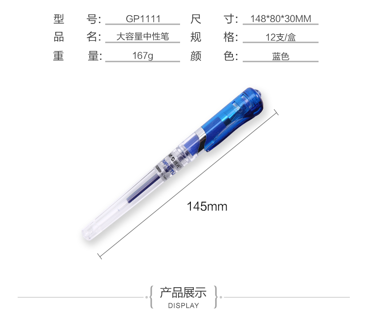 商品名称:晨光中性笔天空5号GP1111蓝0.7 12支/盒