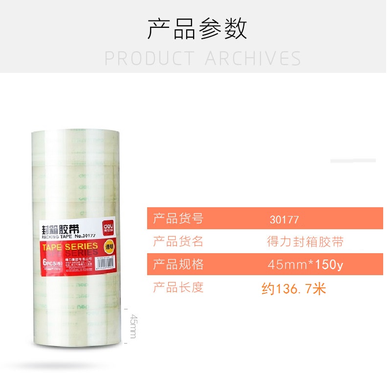 商品名称:得力30177透明封箱胶带 45mm*150y打包胶带 6卷/筒 (单位:筒)
