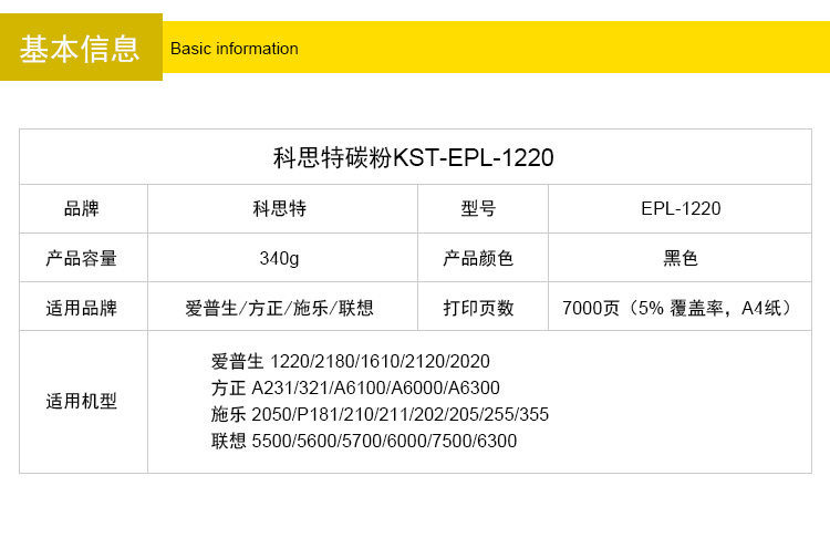 A4,5%覆盖率,打印量7000,加粉量340G Epson 1220/2180/1610/2120/2020;方正 A231/321/A6100/A6000/A6300;施乐 2050/P181/210/211/202/205/255/355;联想 5500/5600/5700/6000/7500/6300