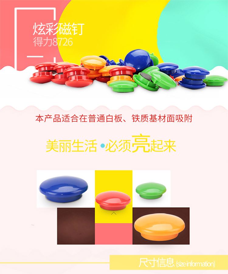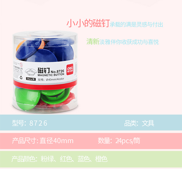 商品名称:得力(deli) 8726彩色白板磁钉 φ40mm 24粒/筒 (单位:筒)