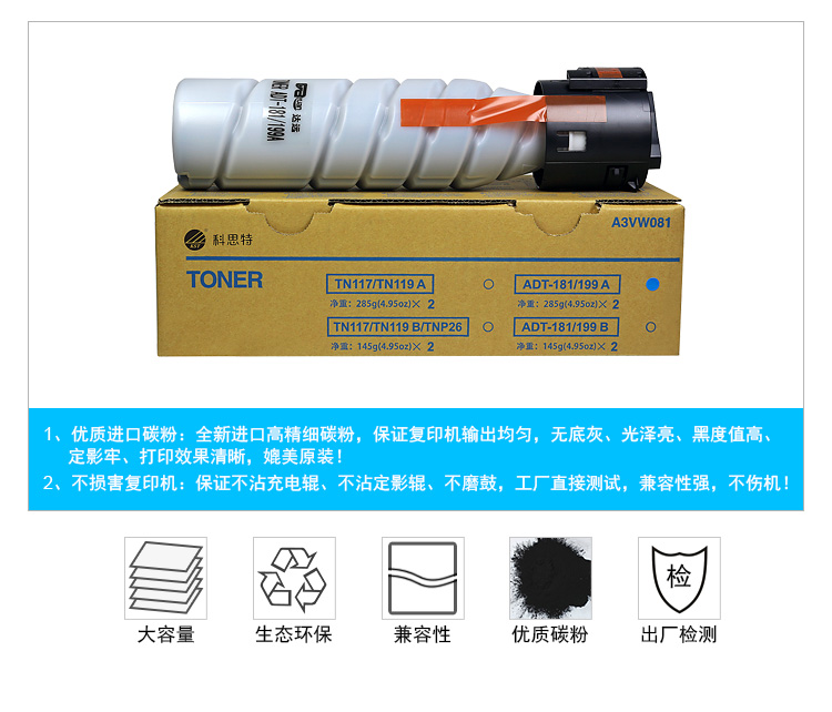 商品名称:科思特 ADT-181A/199A粉盒 大容量 适用震旦AD161/181/188/248/208 黑色