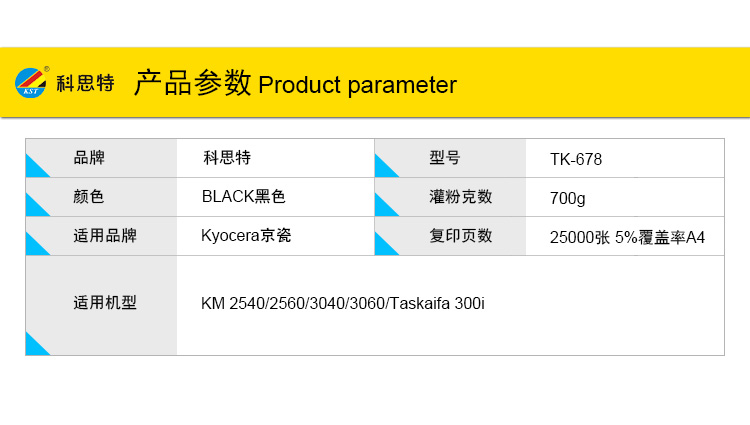 商品名称:科思特 TK-678(带芯片) 粉盒 适用京瓷KM 2540/2560/3040/3060/Taskaifa 300i 黑色