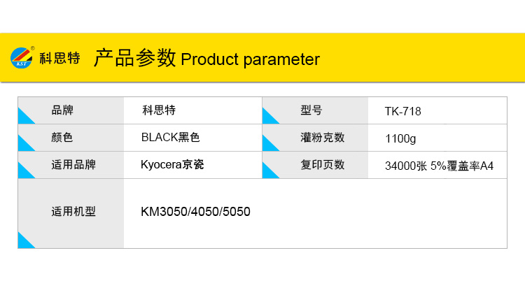 商品名称:科思特 TK-718(带芯片) 粉盒 适用京瓷 KM3050/4050/5050 黑色