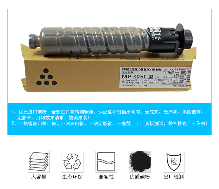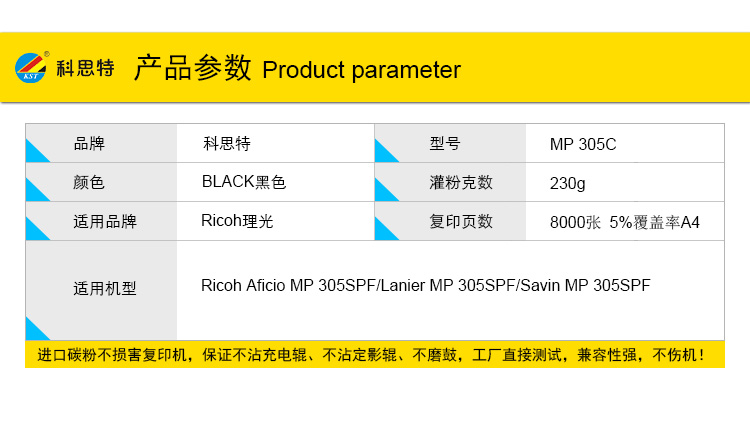 商品名称:科思特 MP 305C(带芯片) 粉盒 适用理光 Aficio MP 305SPF/Lanier MP 305SPF/Savin MP 305SPF 黑色