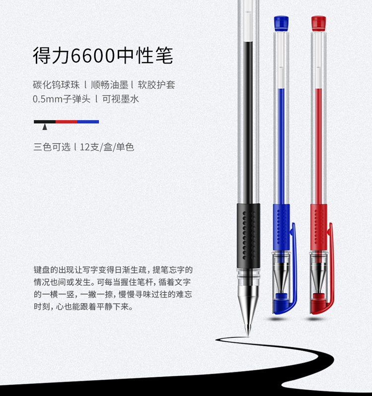 商品名称:得力(deli) 6600中性笔 经典拔帽款签字笔 子弹头 红色 12支/盒