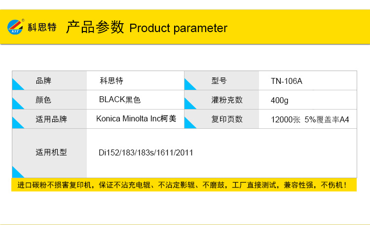 商品名称:科思特 TN-106A 粉盒 适用柯尼卡美能达 Di152/183/183s/1611/2011 黑色