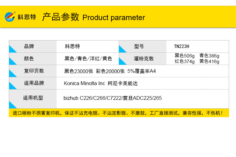 商品名称:科思特 TN223H/ADT225H 粉盒 适用柯尼卡美能达 bizhub C226/C266/C7222/震旦ADC225/265 黑色