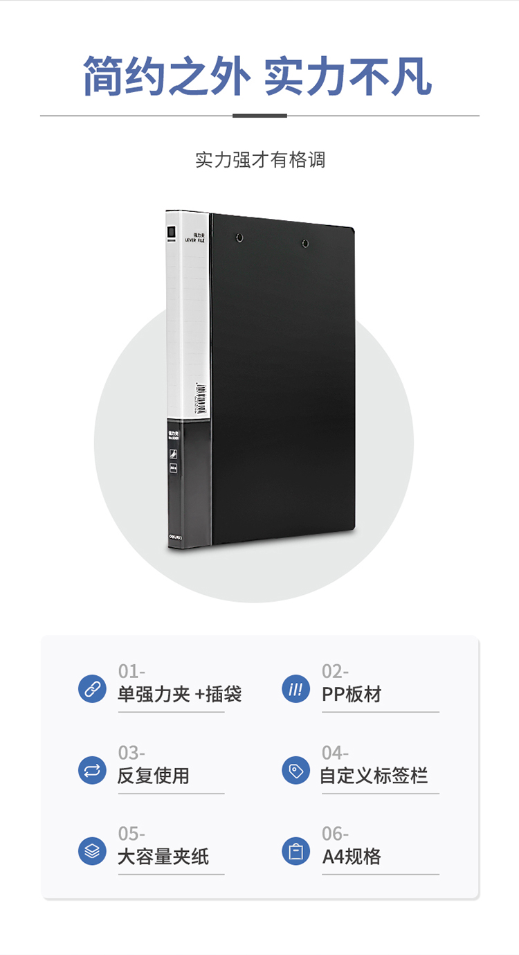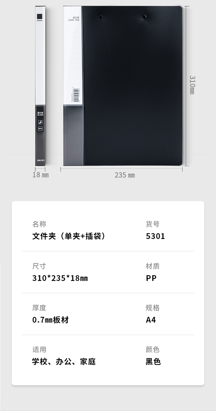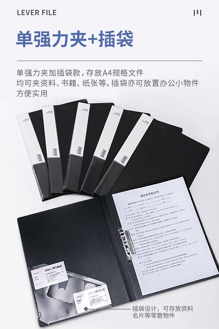 商品名称:得力(deli) 5301金属单强力夹+插页袋硬文件夹 A4 黑色(单位:个)