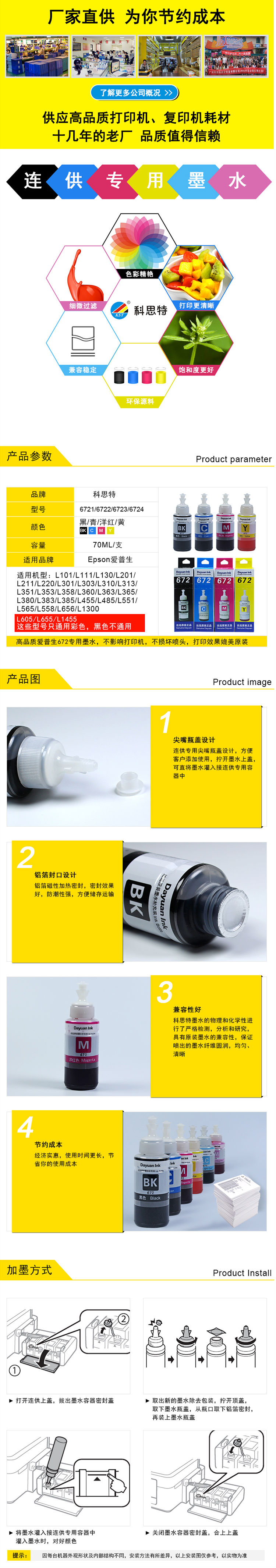 商品名称:科思特 T6722墨水 适用爱普生 L101/L130/L201/L211/L301/L310/L313/L455/L558/L656/L1300/M205 青色