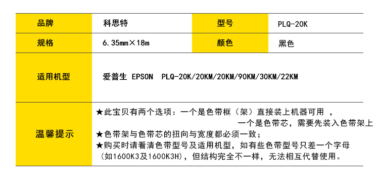 商品名称:科思特 PLQ-20K/90K色带架 适用爱普生 PLQ-20K/20KM/90KM/30KM/22KM 黑色